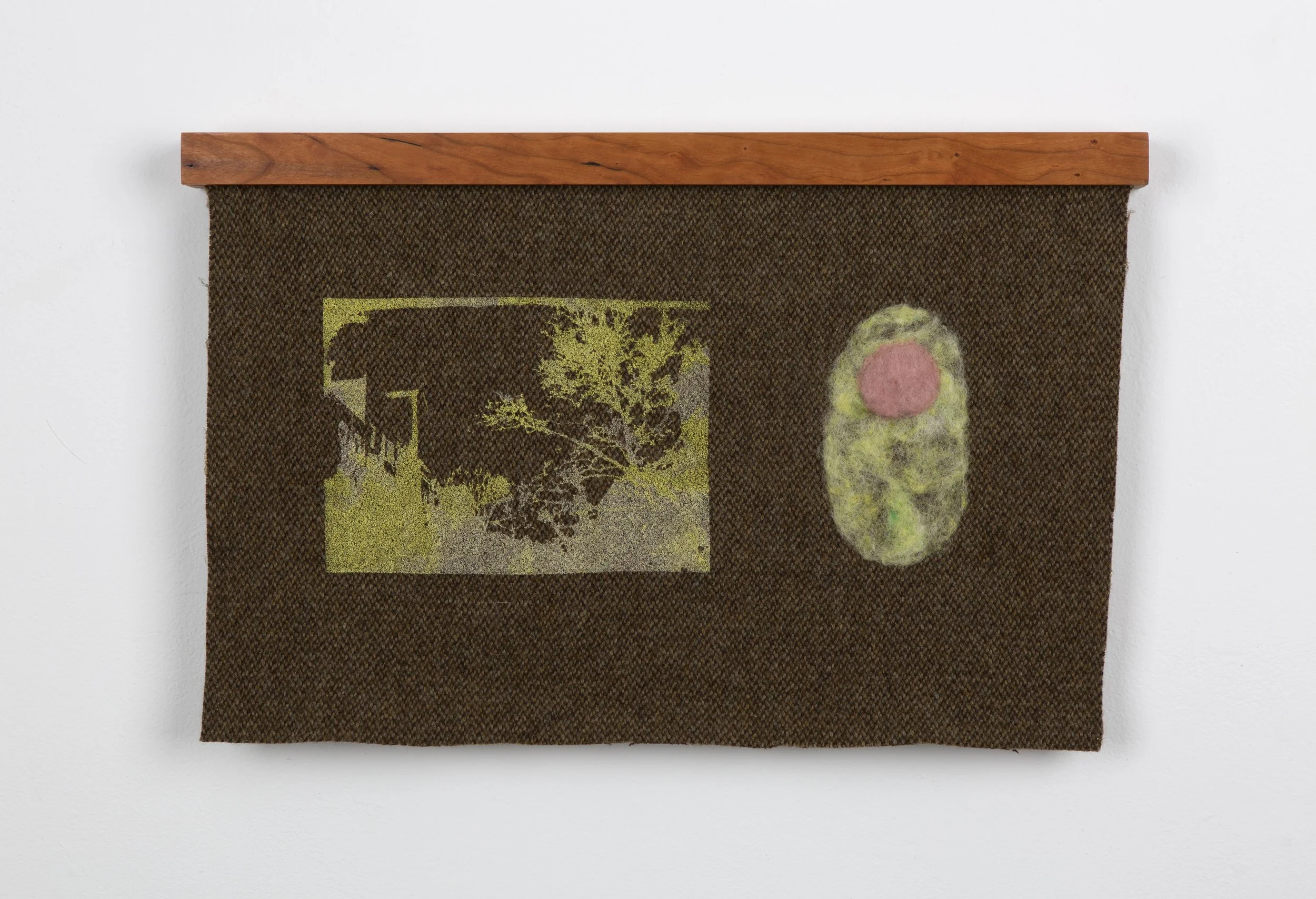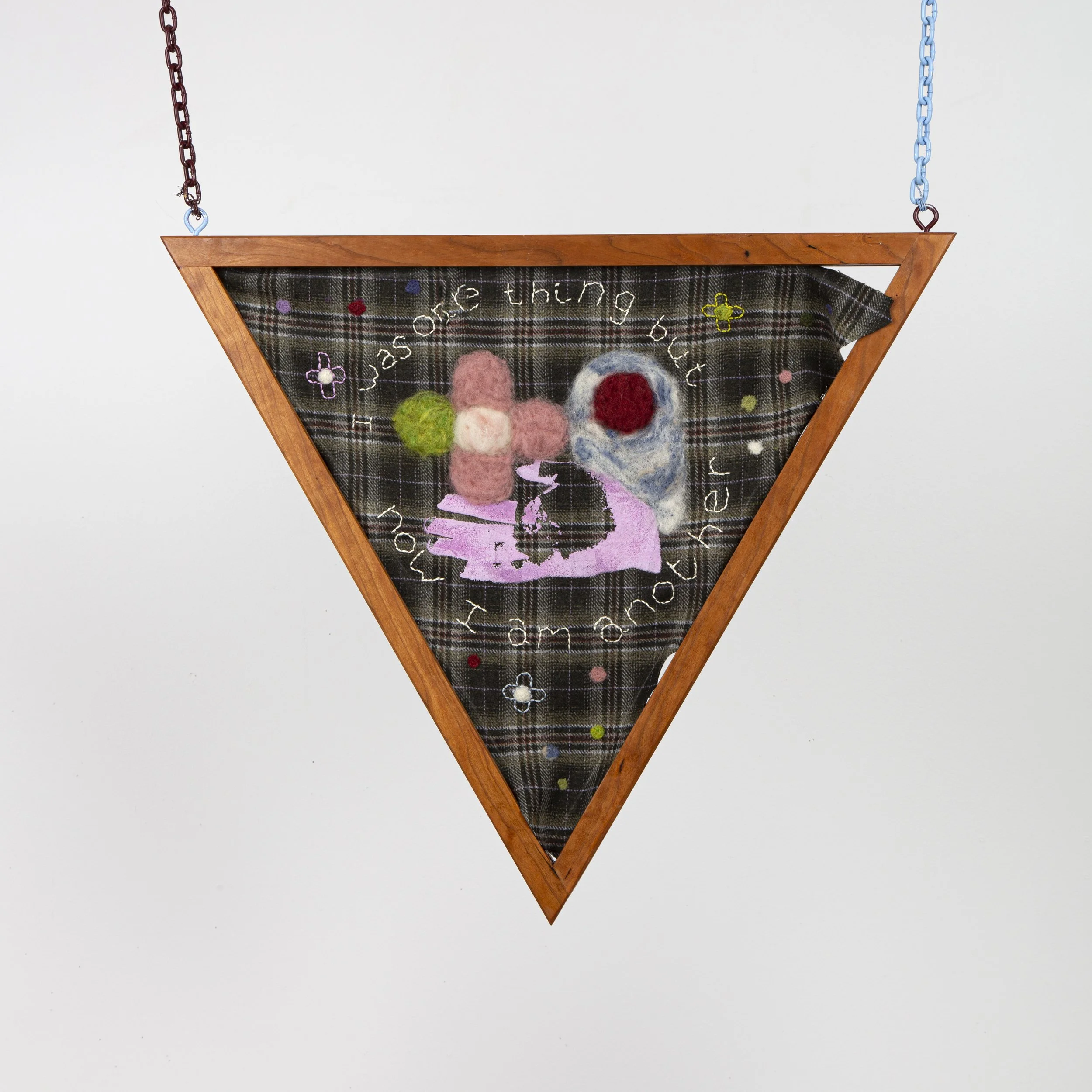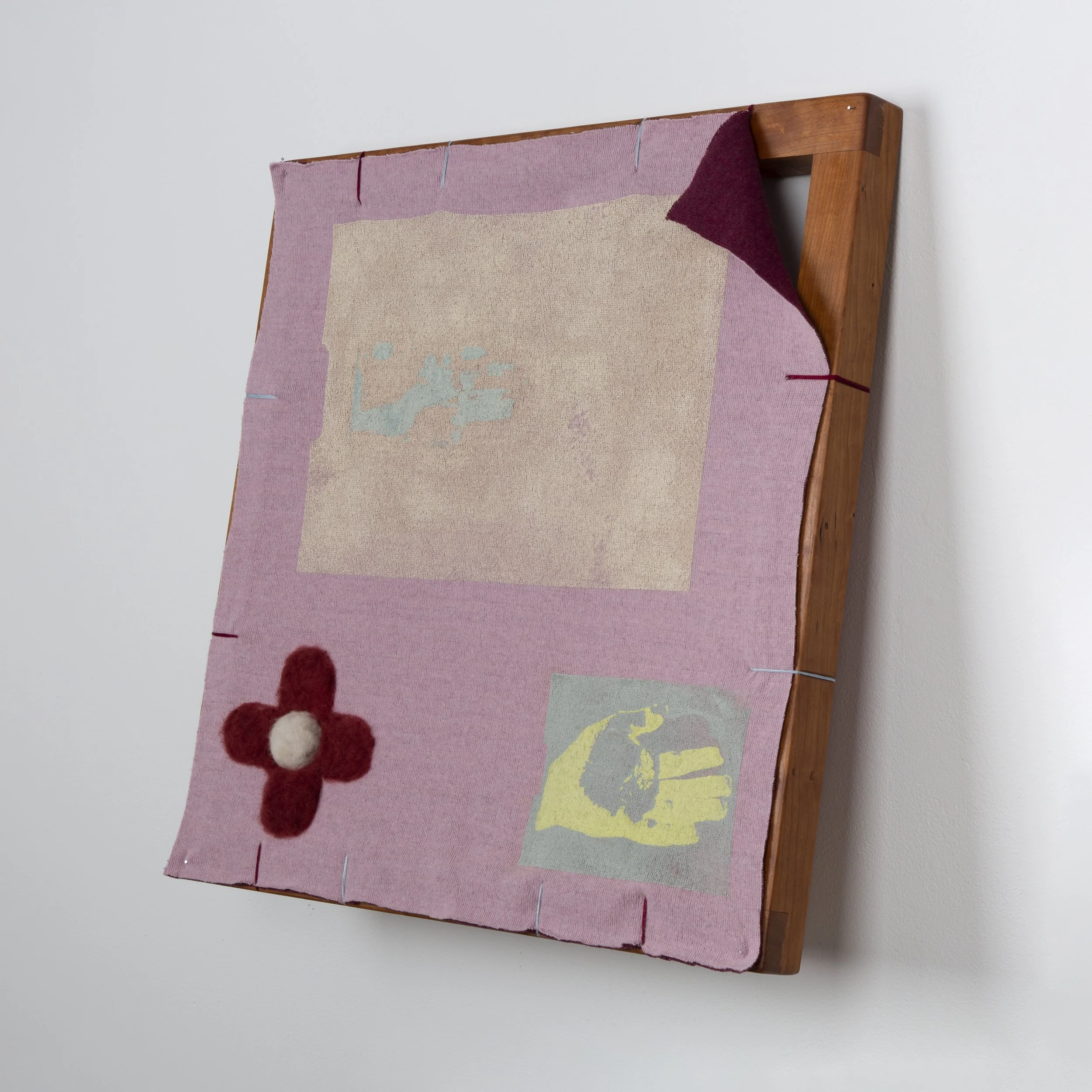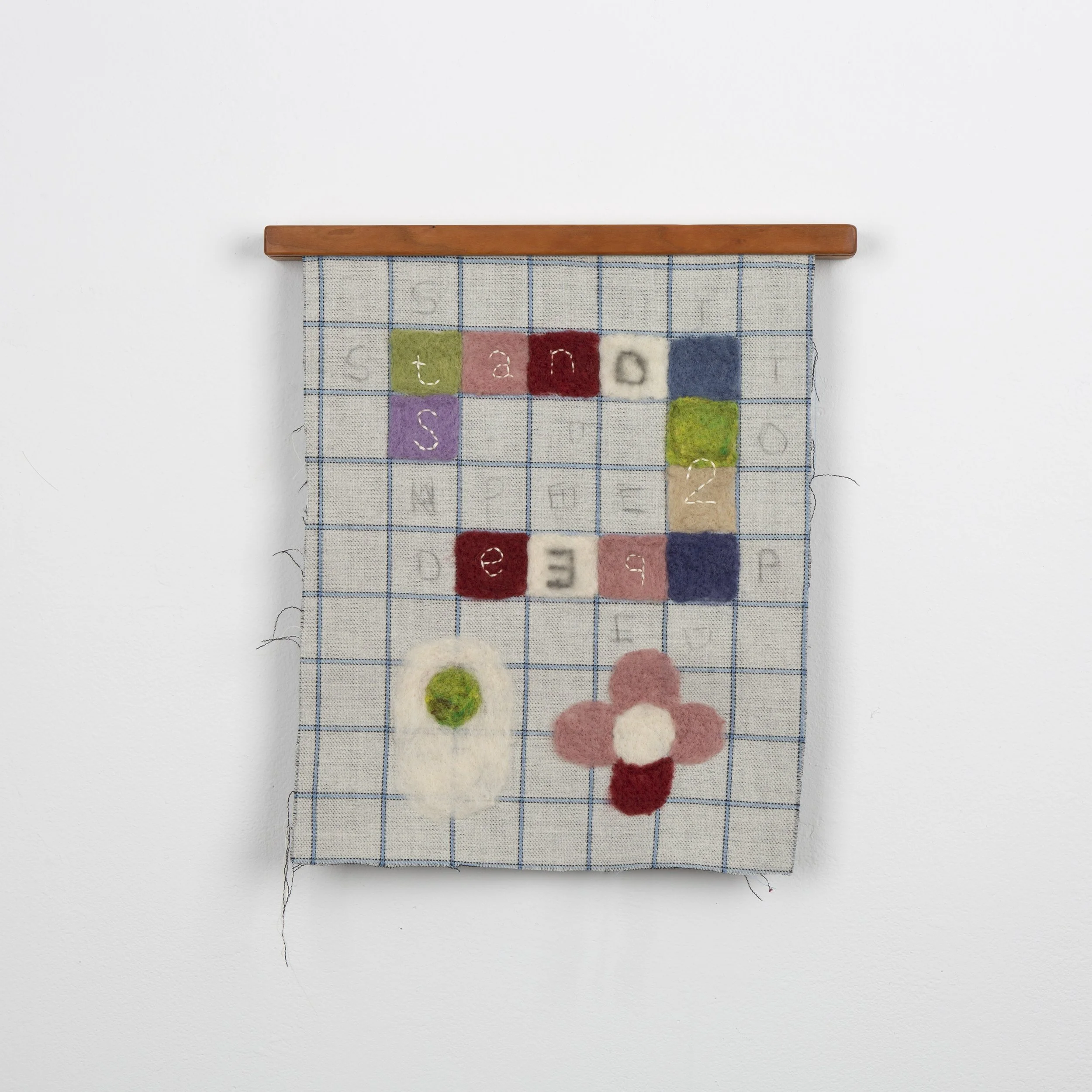 Effeminate Encounters by Moss Y. Loke O'Connor is the artist's first solo exhibition in New York City. The works featured are composed of textile-based sculptural paintings. Fibre-based materials are at the core of these works, with felting and embroidery used to build into the fabric to initiate and reject a series of games being played. Screen-printed imagery is often included and is sourced from personal archives of digital media, medium format and super 8 film. Their work forms an intermediary for queer and trans storytelling as a generous depiction of shared labour. The artist uses wool, thread, and fabric to construct a digital sensibility, making the works behave with a video-game-like quality. Text is peppered into pieces with sewn lettering and pencil marks breaking from the predetermined lines of the fabric. An emphasis is placed on breaking from the grid and building out from it without trying to mask its existence. Rejection without erasure. The binary programming becomes a playful place for the works to move through, behind, and between the structures. The woodwork supports masculinise the space, with the deep orange cherry hardwood reminiscent of a traditional leather-clad home study. Masculinity is replanted into a domestic space in which the virtues of patience and strength emerge.